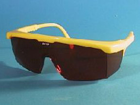 Safety spectacles, adjustable temples, clear anti-scratch polycarbonate lens, frames yellow, black or blue. With fog-free lens and blue frame.